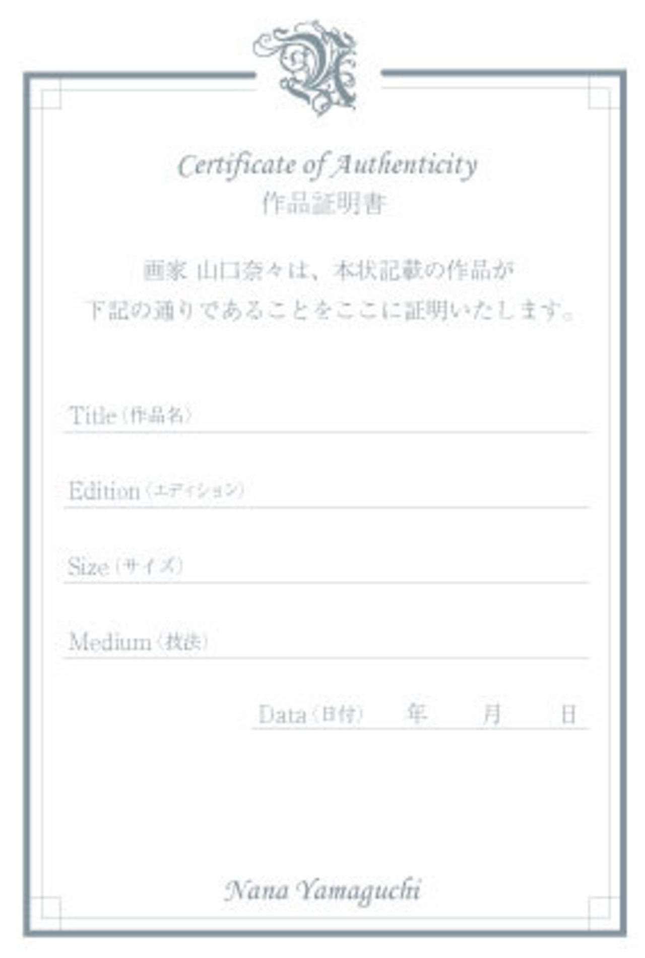 作品証明書にサインと印を押したものをお付けいたします。